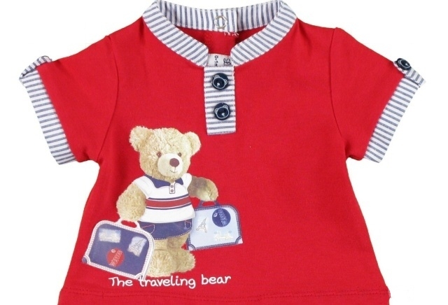 Komplet od španělské firmy Mayoral je vyroben z 96% bavlny a 4% elastenu. Tento komplet je zajímavý tím, že je vcelku, jako overálek.Triko je zdobenopotiskem a efektnímy proužkovýmy lemy což budí dojem vrstvení trika a košile,je celopropínací na druky na zádech. Vnitřní nohavice u kraťásků je propínací na druhy, pro snadné přebalení.