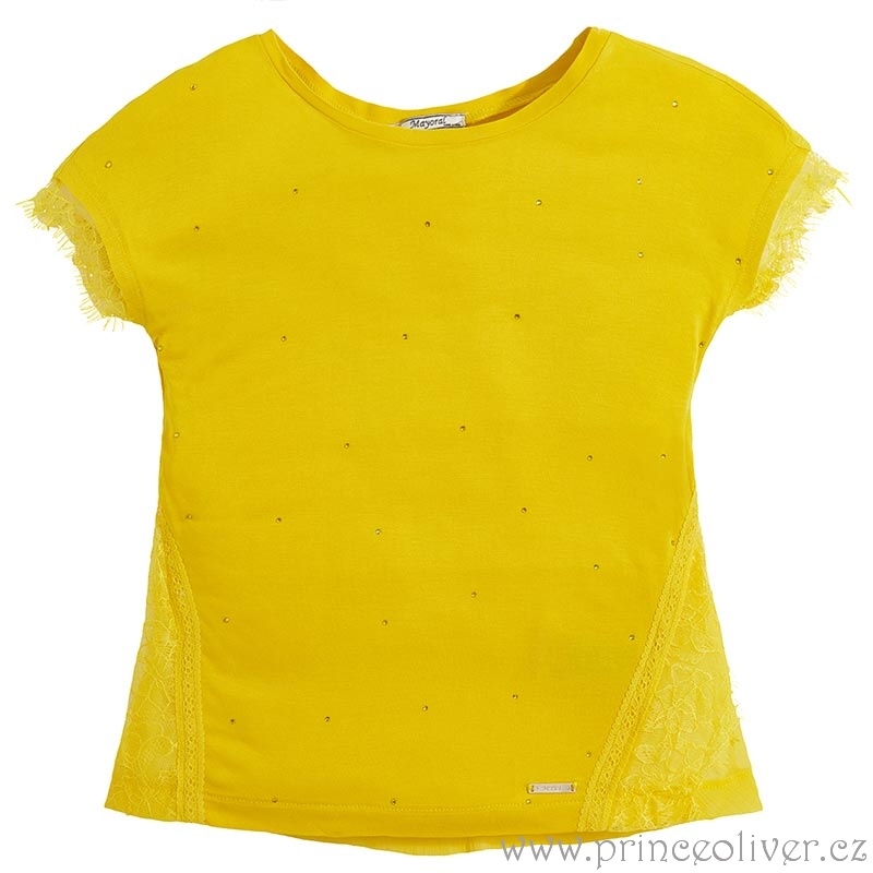 Dívčí triko španělské značky Mayoral. Materiál 50% polyesteru a 50% viskozy. Triko je zdobeno kamínky a zadní díl trika je ozdoben efektní nášivkou krajky.